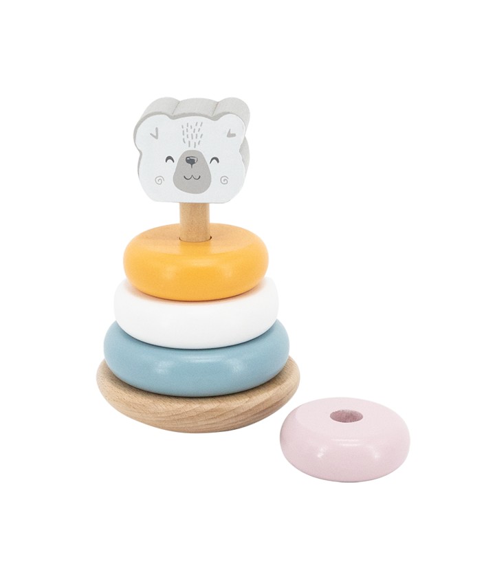 Wooden toy pyramid made in soft colours, the elements are large, rounded. It consists of a stand, 4 rings and a cute face of a bear.
